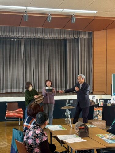一つのテーブルに4~5人ずつ、6つグループをつくり、テーブルごとに、古道具を置き、まち図書3人と社協さん、地域おこし隊がテーブルで道具について対応。